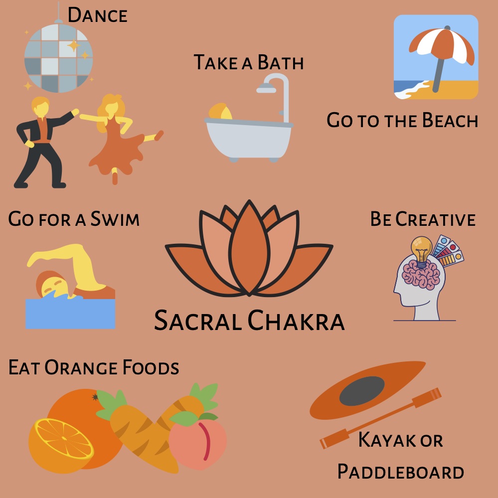 If yoga isn’t your thing you can dance, hoola hoop or do something creative to activate your svadhishthana chakra. It can be singing, dancing, drawing, photography or any other form of expression. You can also do something involving water like going to a beach, swimming, surfing, kayaking or paddle boarding. If you’re at home, take a bath or swim in a pool. Wearing orange, lighting an orange candle and eating orange foods like nectarines, oranges and carrots can help balance your sacral chakra.