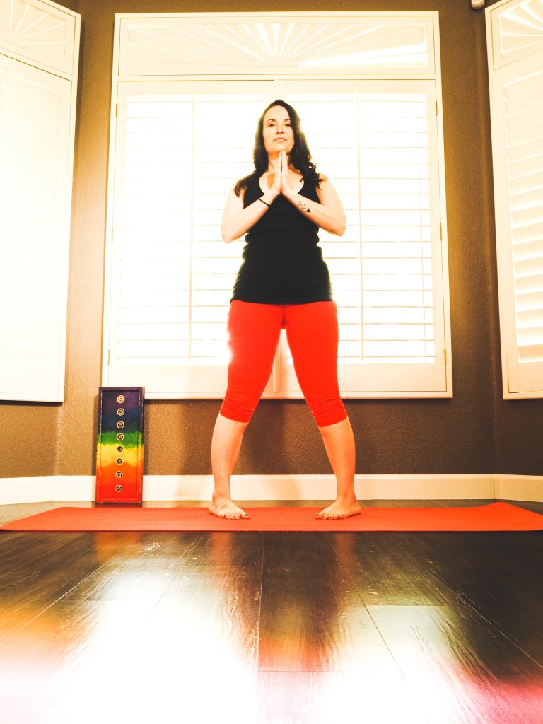 Stand nice and tall at the front of your mat with your big toes touching and the heels slightly apart.